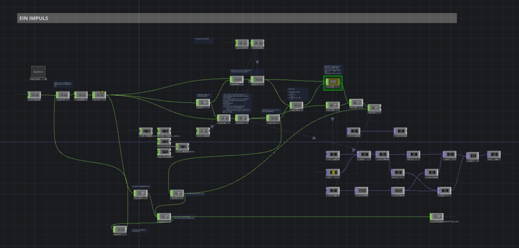 Wir erstellen mehrere Cues, die entweder von unserem TouchDesigner-Team über MIDI angesteuert oder ab Songbeginn nach einer festgelegten Sekundenanzahl automatisch getriggert werden. Da sich unser Track nicht verändert, ist diese Vorgehensweise sehr gut umsetzbar. Über Effekte wie Bewegungen der Moving Heads, Helligkeitsveränderungen und Farbwechsel – die wir zusätzlich an die BPM unseres Songs anpassen – können wir rhythmische Bewegungen passend zur Musik visualisieren. Alle Leuchten, die sich im Verlauf unseres Erlebnisses verändern, sind mit unserem grandMA2- Pult verbunden und werden darüber gesteuert.