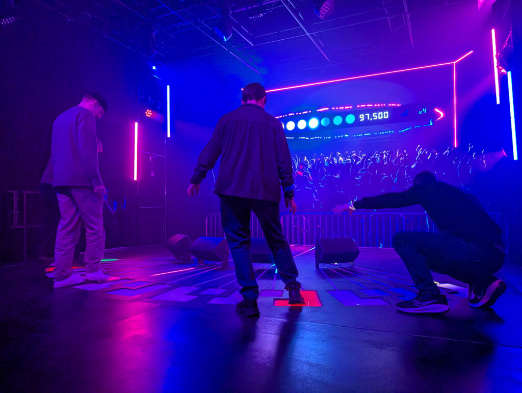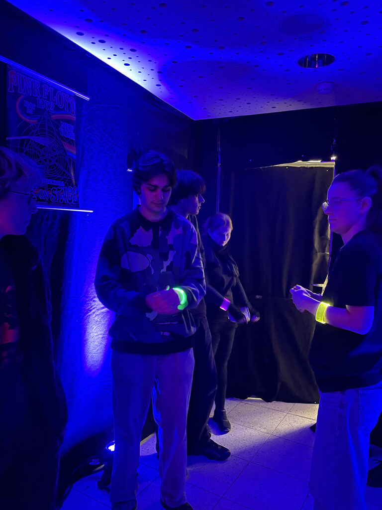 Auftritt, ein interaktiver Experience Space für 4 Spieler*innen, macht uns zu berühmten Bandmitgliedern. Mit Leuchtarmbändern wird gleich schon eine Einteilung gemacht.
