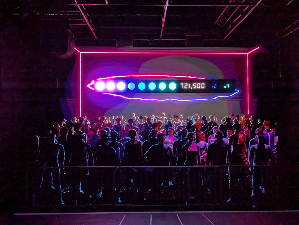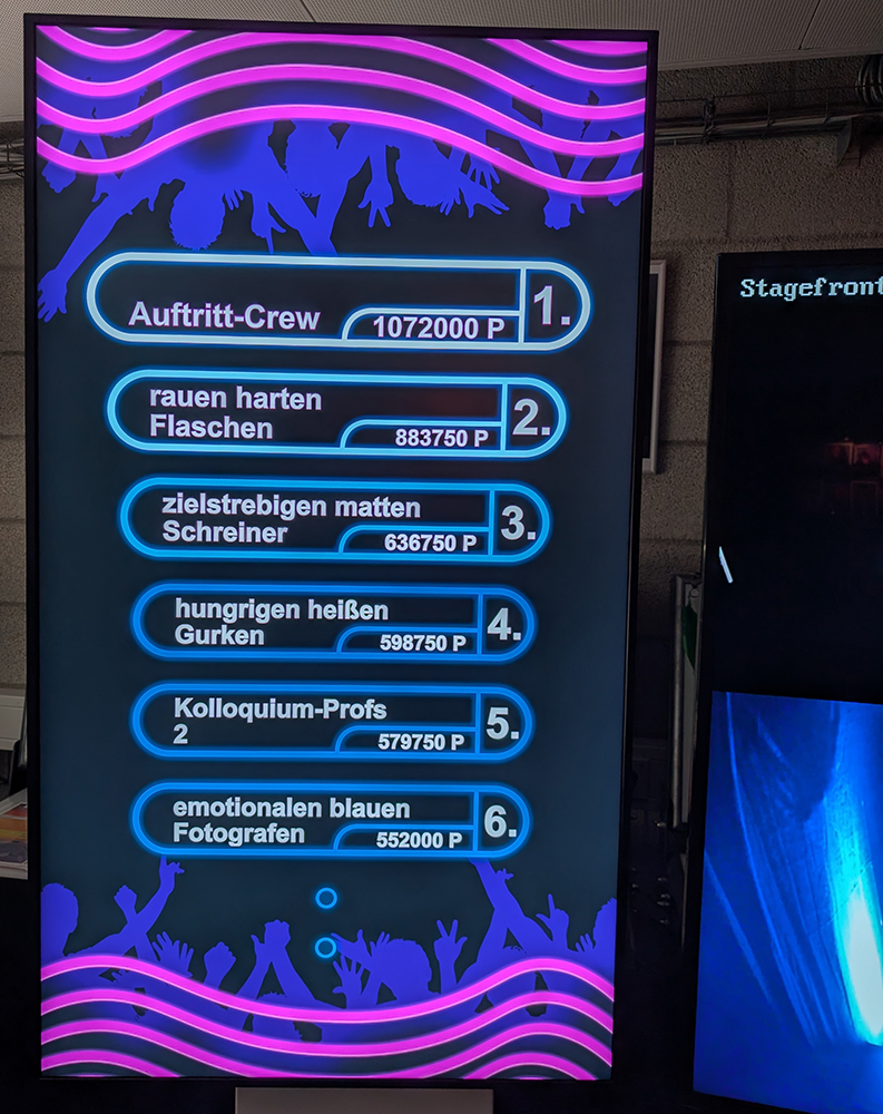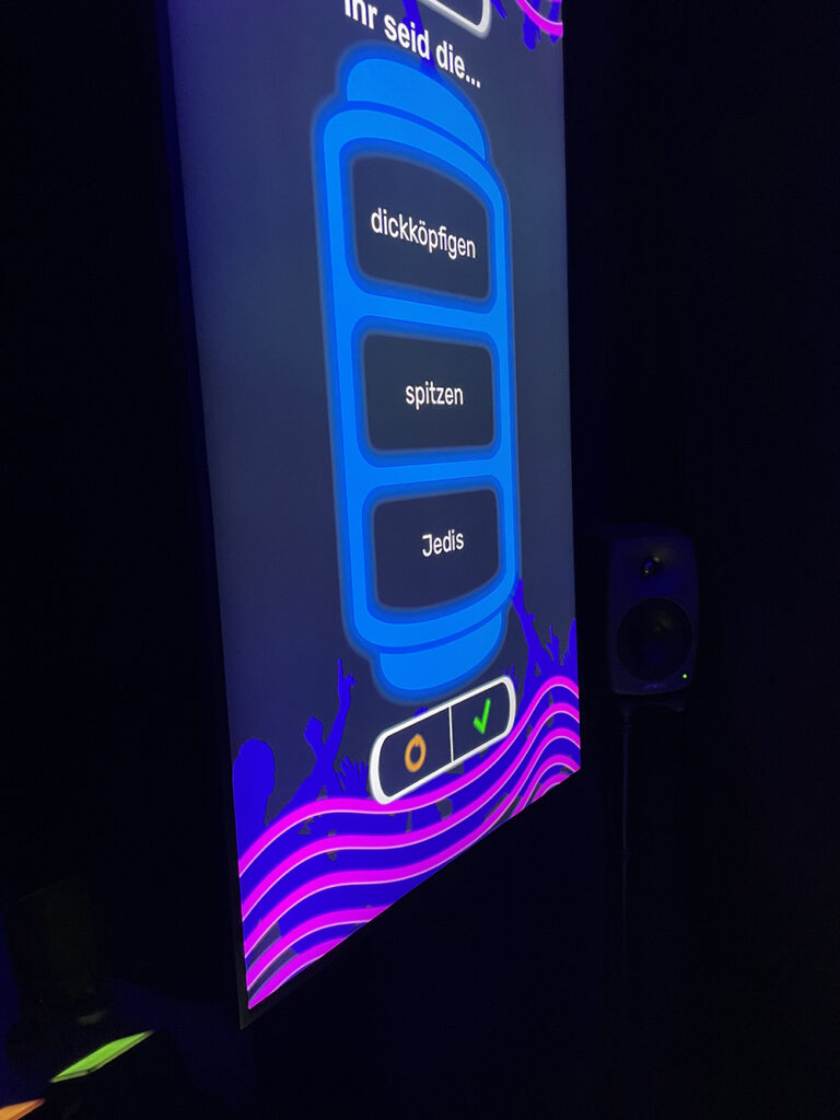 Je besser es geht, desto mehr Punkte und desto lauter feuert uns die Crowd an. 4 Monitoring Boxen für die Spieler*innen und der Spatial Sound wird durch eine Vielzahl weiterer Boxen zum live Erlebnis. Das Publikum, also die Crowd ist für 10 Reaktionen mit Sound und Bewegungen gestaltet.