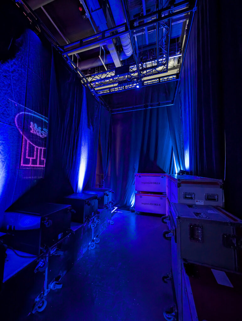Wir machen alles selbst. Bühnenbau, interaktive Trittfelder, Medienbespielung durch Bild, Ton, Licht, Haze. Kurz: alles was zum Showmoment gehört wird bedacht.