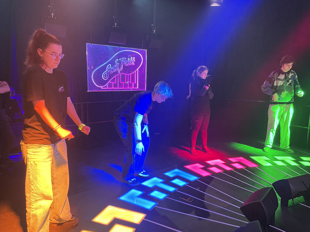 Über drei Stufen tritt die neu gegründete Band auf die Bühne. Die Crowed steht schon da. Das ist eine tolle Geräuschkulisse. Wie in echt. Das überdimensionale Instrument liegt vor uns. Vier Spieler*innen, jeweils fünf Tasten – gespielt mit den Füßen. Gemeinsam entsteht die Leadmelodie unseres komponierten Songs. Die Idee ist nicht neu. Die Ausführung ist es schon.