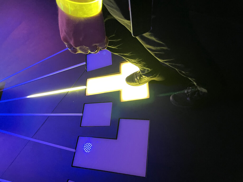 Die Trittfelder werden mit unterschiedlichen Prototypings auf Usability getestet. Jeder soll sie bedienen können, ohne das Gleichgewicht zu verlieren. Die Tasten werden für starken und leichten Druck, auf viel und wenig Gewicht getestet. Ausgemessen, zugeschnitten, zusammengesetzt, verkabelt und programmiert. Jede Menge Arduinos, es wird gelötet und mit einer Unmenge an LED Lauflichtmetern wird die Bedienung verständlich. Das Feedback bilden Ton, Licht und Animation des Publikums ab.