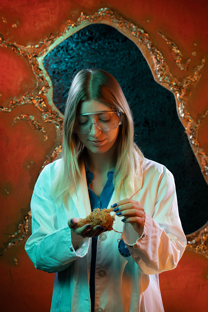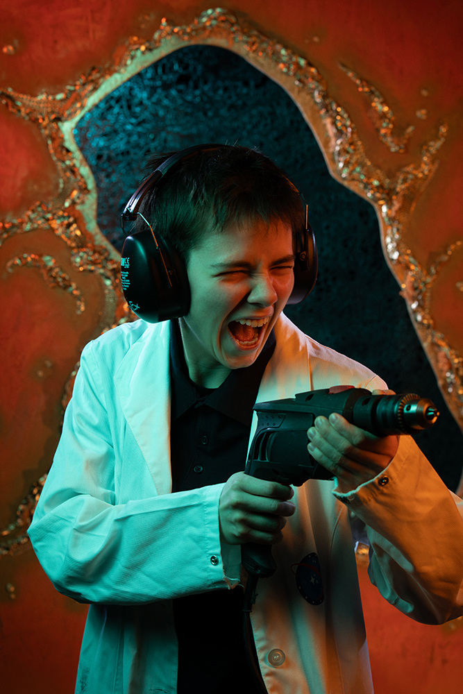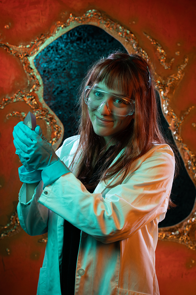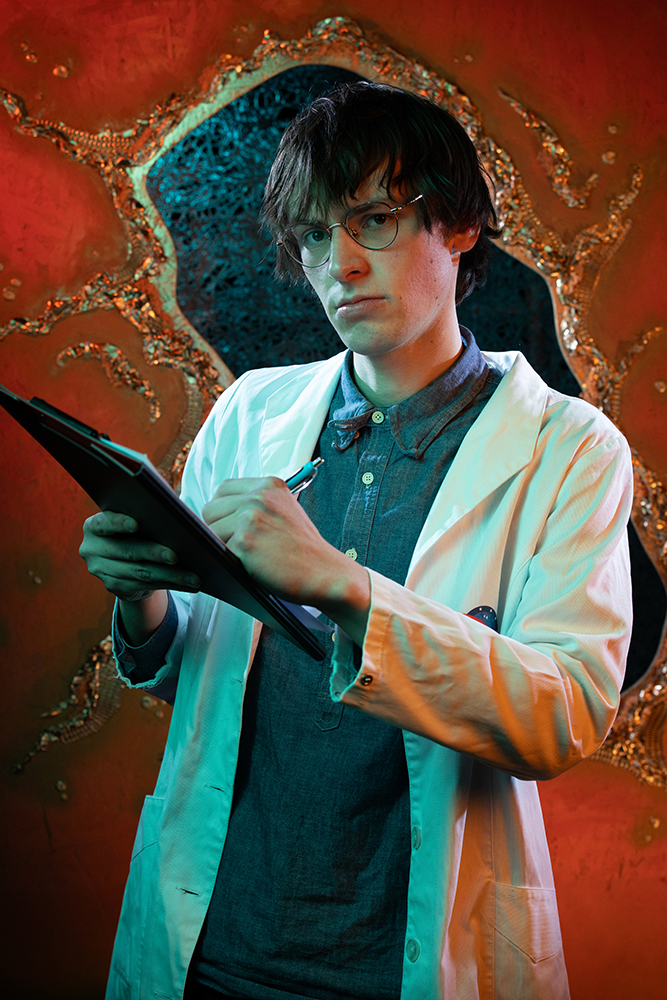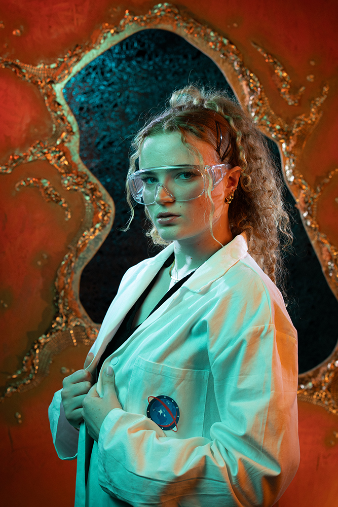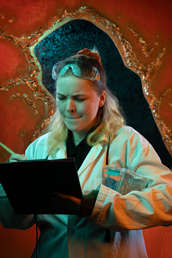 Ursula Drees: Ursula Drees, seit 2008 betreuende Professorin von Spatial Experience/EventMedia an der HdM. In der jetzigen Produktion bin ich eine Wissenschaftlerin ganz hinten im Labor. Diese Kapsel ist mir irgendwie unheimlich. Wer weiss was sich darin verbirgt? Ich wette die Ausserirdischen bringen uns alle um.