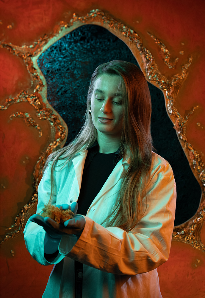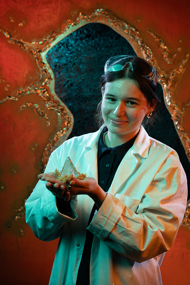 Chantal Paulus: Ich bin Chantal im 5. Semester und experimentiere im Labor mit Materialien und erforsche, wie sich Informationen durch Formen und Farben vermitteln lassen.