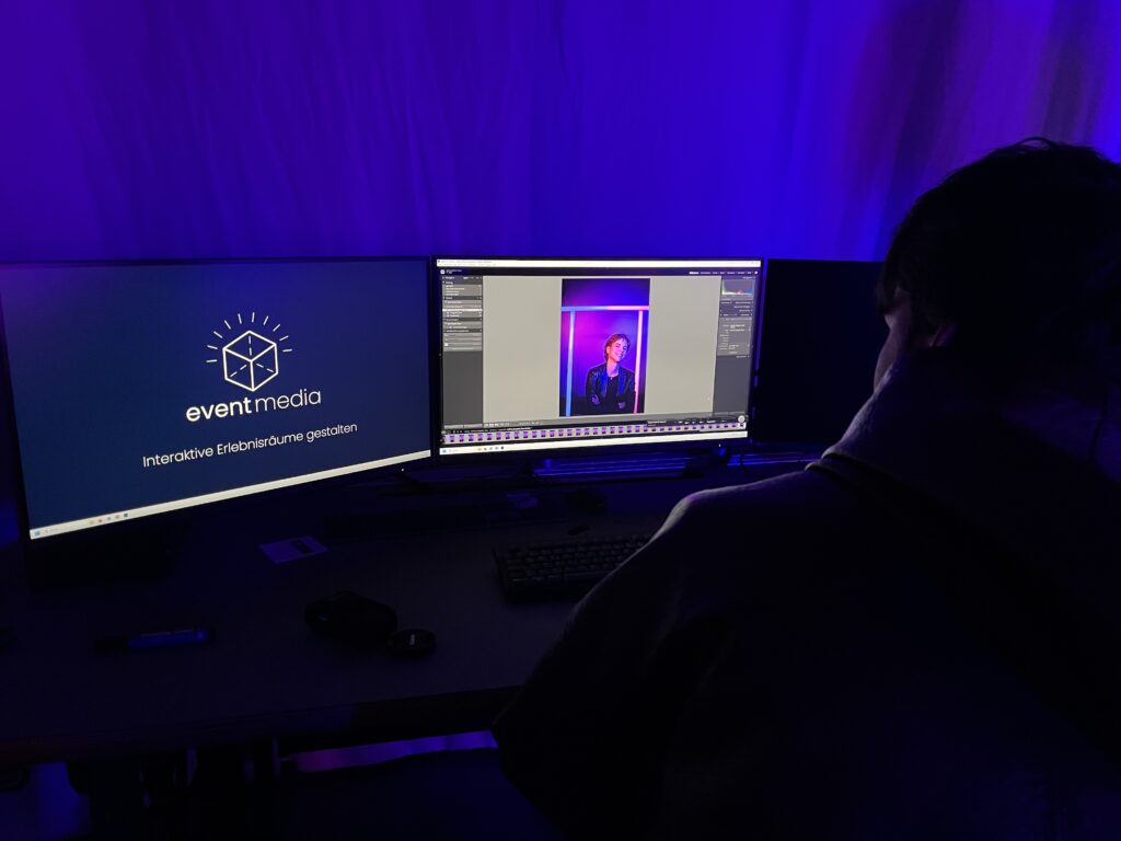 Diese beiden Merkmale sind Hauptbestandteil der Logo CI, deshalb werden sie auch in unsere Teamfotos eingebunden. Im Hintergrund gibt ein Rahmen aus LED-Streifen in unseren Farben den Motiven eine Passung, das Gesicht und der Hintergrund werden ebenfalls in kräftigem Blau und Lila Licht von links und rechts angestrahlt.